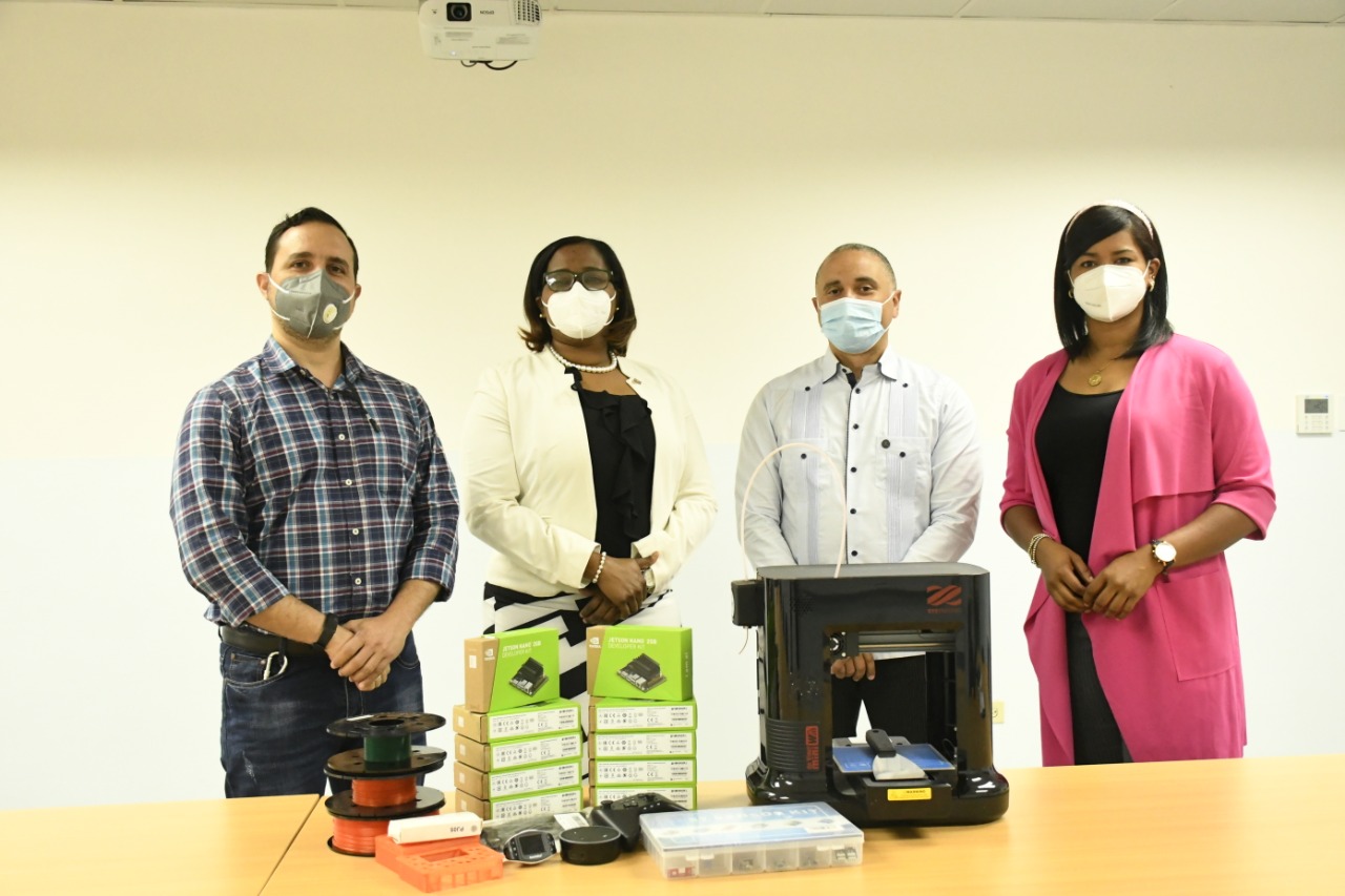 Forman parte de la donación 1 kit de Desarrollo de Inteligencia Artificial NVIDIA Jetson Nano 4 GB para instructor, 10 kits de Desarrollo de Inteligencia Artificial NVIDIA Jetson Nano 2 GB para estudiantes, 1 impresora 3D, 1 cámara USB, 1 cámara visión nocturna, 3 cables USB, 2 memorias de 32 GB, entre otros.
